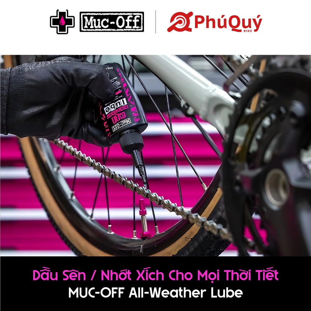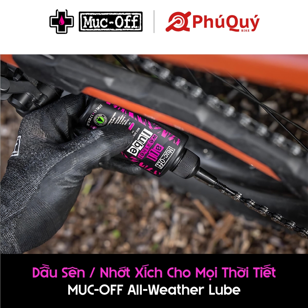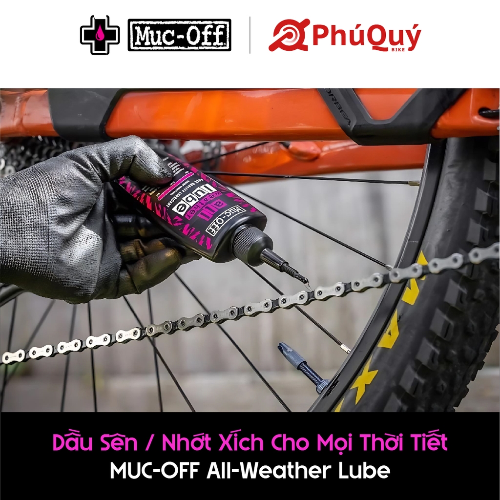 Muc-Off All-Weather Chain Lube là nhớt bôi trơn hiệu suất cao. Với đặc tính kháng nước, công thức khó bị rửa trôi tạo nên lớp phủ bảo vệ sên và hạn chế hao mòn kim loại trong quá trình đạp xe. Sự kết hợp độc đáo của các thành phần đảm bảo độ bám tốt trên sên ngay cả với địa hình khắc nghiệt nhất, đem đến sự bảo dưỡng xích xe đạp tối ưu nhất. Công thức độc quyền của Muc-off mang đến sự mượt mà và êm ái trong suốt quảng đường dài ở mọi điều kiện địa hình và thời tiết khác nhau.