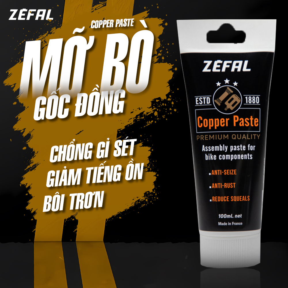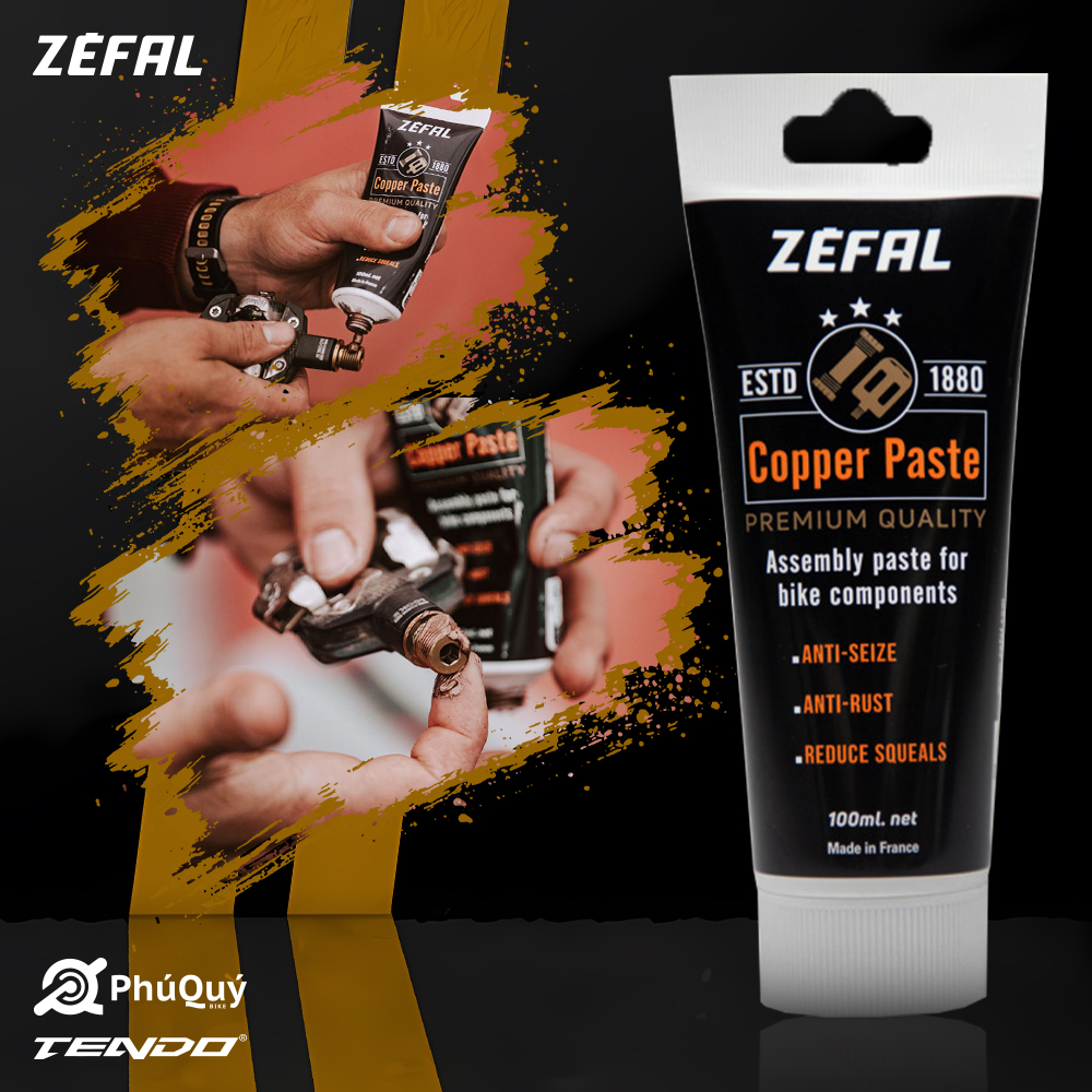 🔥 Zefal Copper Paste là hợp chất kem gốc đồng, dùng để lắp ráp các chi tiết như cọc yên, pedal… Sản phẩm có tác dụng giúp cho hai mặt tiếp xúc kim loại khi lắp ráp không bị siết quá chặt gây nứt hoặc hư hỏng linh kiện.